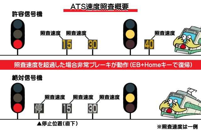 ATSは注意または停止信号、線路終端部の手前に速度照査を設けています。